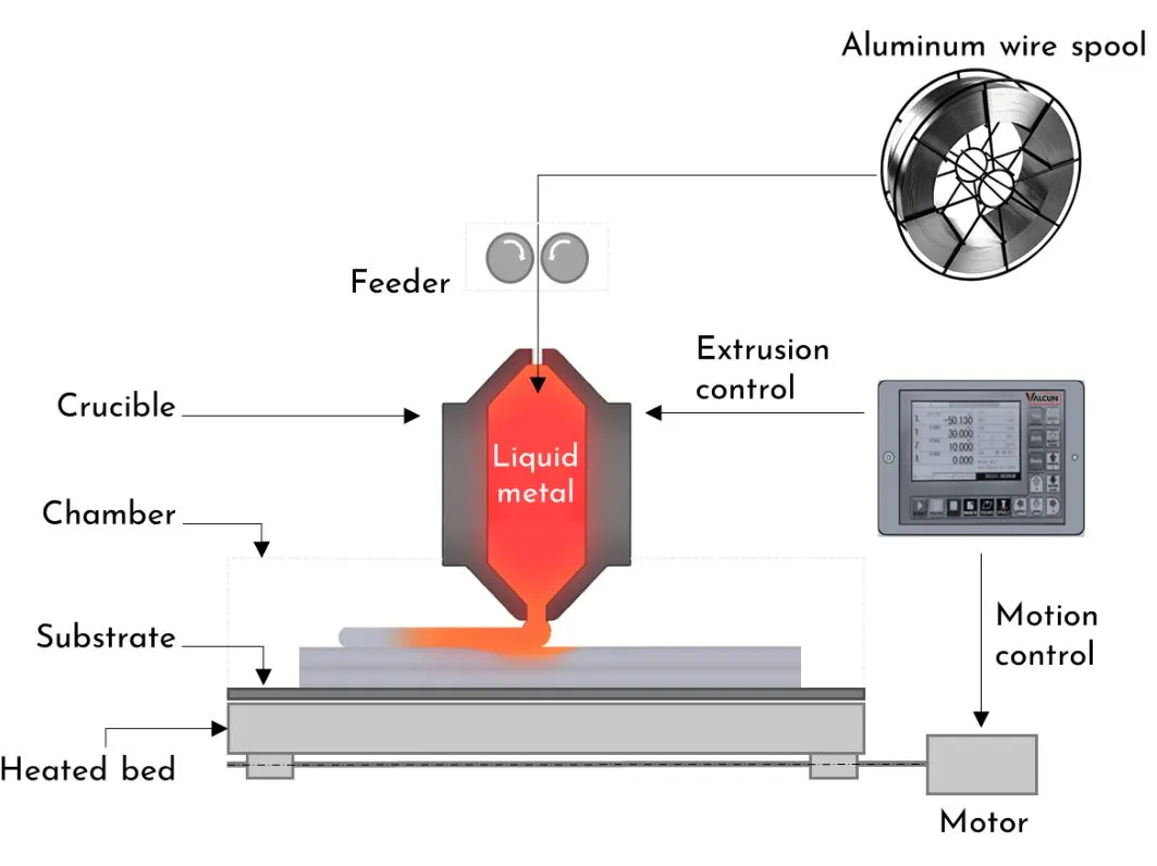 Technical principle: The metal wire raw material is melted and directly extruded into the final component. During the deposition of molten metal, the long wire is fed into the heating chamber by the feeder. Metal melts in this heating chamber. There is a nozzle at the bottom of the chamber through which liquid metal is extruded. The extruded metal fuses with the previous layer (or substrate) to form a component. At the end of the process, the component can be easily separated from the substrate.