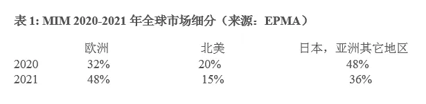 Paul Davies from Sandvik Additive Manufacturing in the UK summarized the current situation and prospects of the MIM industry in Europe and around the world from recent market research and other sources. According to data cited by Data Bridge Market Research, it is expected that the value of the European MIM market will reach approximately 1.6 billion euros by 2027, with a compound annual growth rate of 11.6% from 2021 to 2027. With the recovery of the epidemic, the demand for MIM powder in 2021 has increased by more than 14% compared to 2020. It is said that the demand growth is mainly driven by the automotive industry. The market growth in Europe has increased its share of the world market from an estimated 32% to 48%, surpassing Japan and other regions in Asia (Table 1).