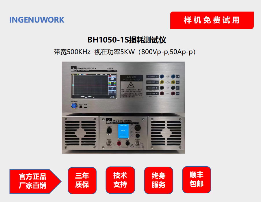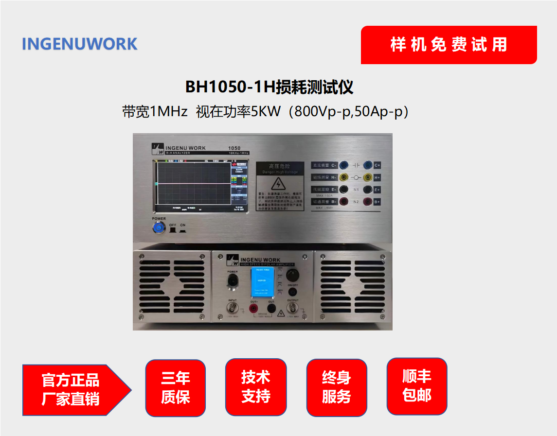 This device measures the alternating magnetic properties of soft magnetic materials.BH1050 magnetic core loss tester is a specialized instrument for measuring magnetic core loss, equipped with a high-power high-frequency sine wave power supply, which can provide maximum 1600Vp-p@100Ap-p The current drives high-power magnetic core inductors.