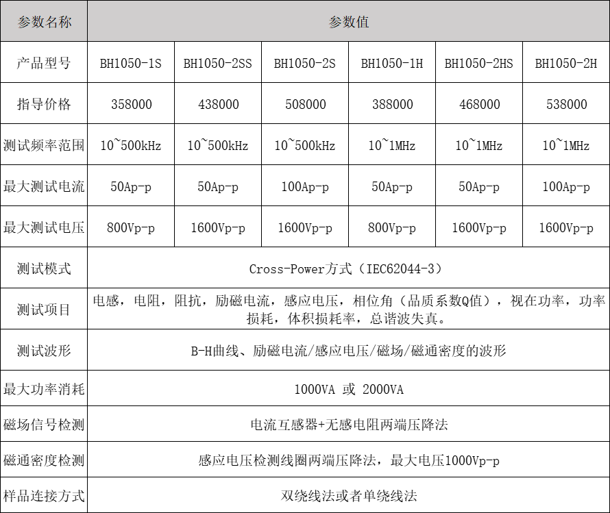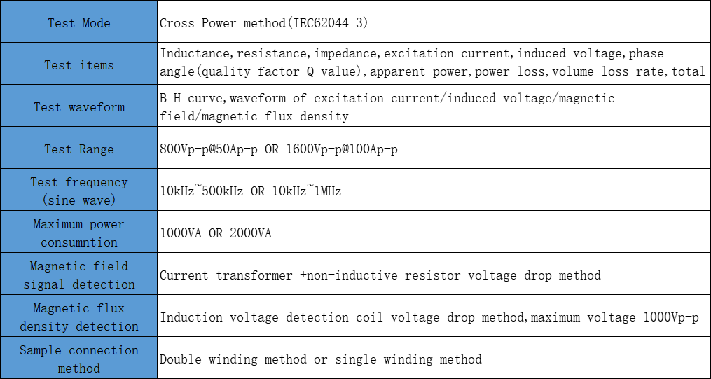 The BH1050 adopts the Cross Power mode (IEC62044-3), and the BH1050 host is equipped with a high-power, low distortion high-frequency amplifier power supply. The amplifier power supply drives the tested inductance to reach the required frequency and magnetic flux density for testing. Then, the current signal flowing through the inductor and the voltage signal at both ends of the inductor are obtained through a high-speed data collector. After accurately measuring the amplitude and phase difference of the signal, the loss power can be calculated.