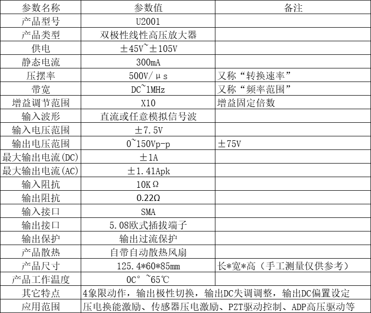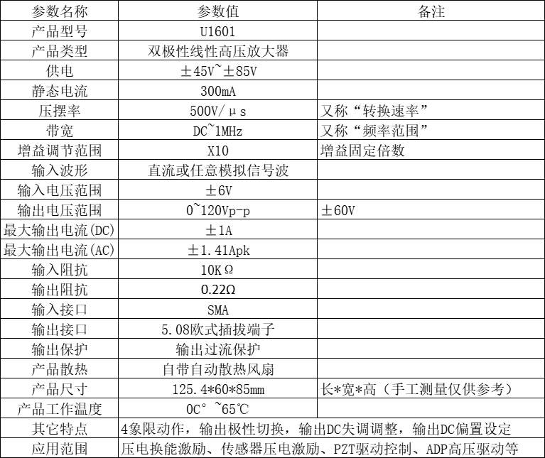 U1601/U2001高速功放模块是固定增益为10的高速放大器,在输出电流不超过额定值的情况下可以驱动电阻负载,电容负载和电感负载,具备稳定的四象限动作能力。应用范围包括压电换能激励、传感器压电激励、PZT驱动控制、ADP高压驱动等。本产品可接受定制,欢迎来电咨询!
